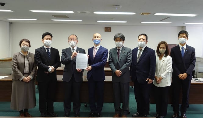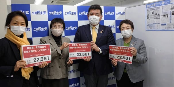 ▲パリテキャンペーンの署名と要望を立憲民主党大阪府連合幹事長と野村(幹事長代理)で受けました。