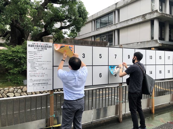 6月22日(水)には公示を迎え、枚方市内では労働組合を中心に大阪府選挙区のポスター貼りが一斉に始まり、選挙戦の火ぶたが切って落とされました。