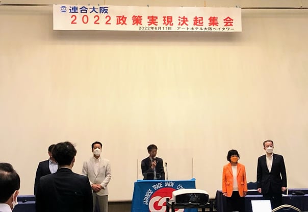 6月11日(土)は、連合大阪2022政策実現決起集会として、連合大阪が推薦する参議院選挙に向けた意思合わせが行われました。大阪選挙区の予定候補者の「石田としたか」さん、「大谷ゆりこ」さんが決意の言葉を述べられ、参加者全員で「頑張ろう!」を行い、選挙戦が始まろうとする熱気を感じる機会になりました。