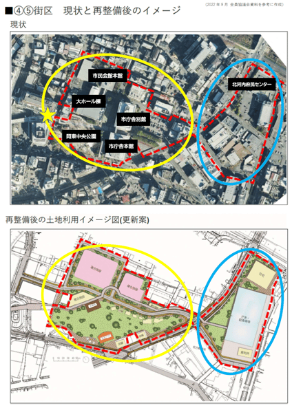 枚方市駅に近い黄色枠の「④街区」の9割以上が市有地です。青色枠の「⑤街区」は、国・府・市の用地が混在しています。現市政は、この枚方市役所周辺の広くて貴重な市有財産を売却し、民間開発事業者にタワーマンション建設等の開発をさせようとしています。
