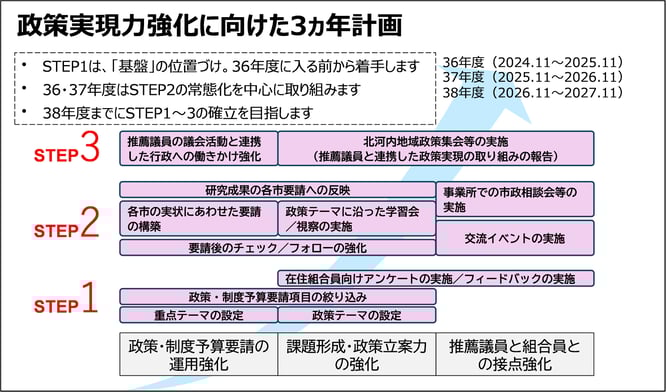 今回の地域委員会では「政策実現力強化に向けた3ヵ年計画」等の補強案を全会一致で確認いただきました。